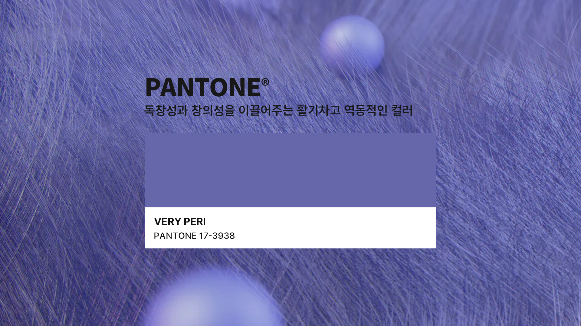 2021년에는 팬데믹을 이겨낼 희망이 전해지기를 바라는 의미로 ‘얼티미트 그레이(Ultimate Gray, #939597)’과 ‘일루미네이팅(Illuminating, #F5DF4D)’ 색상이 선정되었습니다. 이것은 견고한 회색과 생기 넘치는 노란색을 제시하며 우리 사회에 강인함과 생동감의 메시지를 던져주었습니다. 팬데믹이 지속되고 있는 2022년에는 ‘베리 페리(Very Peri, #6667AB)’ 색상을 선정하였는데, ‘올해의 컬러’ 역사상 완전하게 새로운 컬러를 처음으로 제시한 팬톤이 베리 페리를 선정한 이유가 무엇일까요?