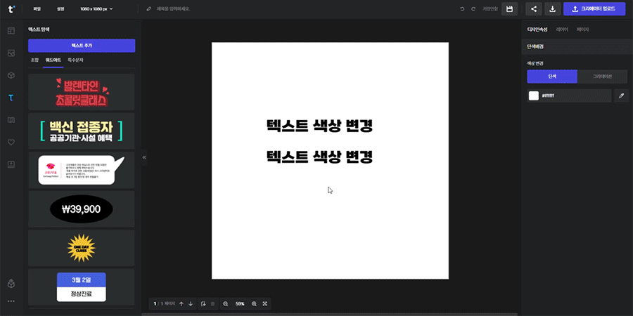 텍스트를 선택 후 우측 속성창에서 [단색/그라데이션] 색상으로 변경 가능합니다.