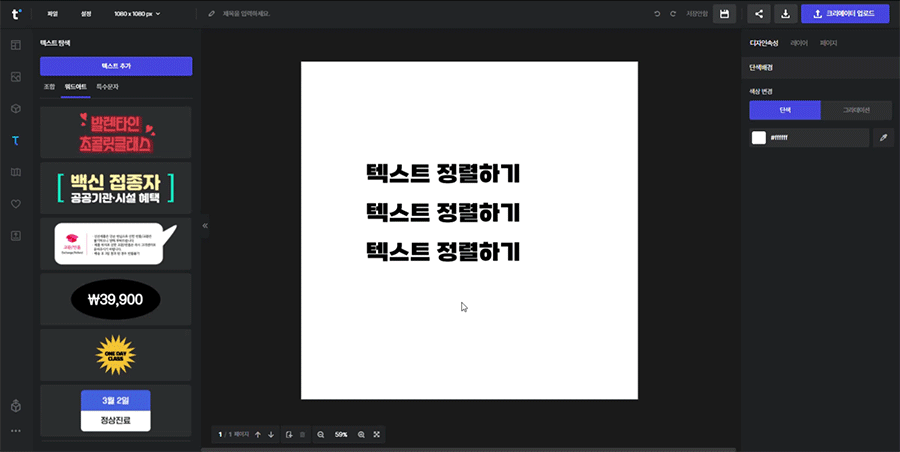 텍스트 박스를 선택 후 우측 속성창에서 [왼쪽정렬/가운데정렬/오른쪽정렬] 아이콘을 선택하면 텍스트 박스의 사이즈에 맞춰 텍스트가 정렬됩니다. 기본은 왼쪽정렬 상태입니다.