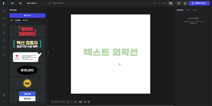 텍스트를 선택한 후 우측 속성창에서 외곽선을 활성화해 줍니다. 외곽선의 색상 변경 및 두께 조절이 가능합니다.