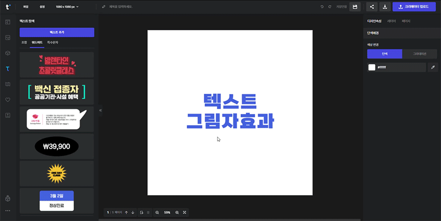 텍스트를 선택한 후 우측 속성창에서 그림자 효과를 활성화해 줍니다. 색상 및 가로 거리, 세로 거리, 블러, 투명도 등을 통해 입체 효과를 줄 수 있습니다.