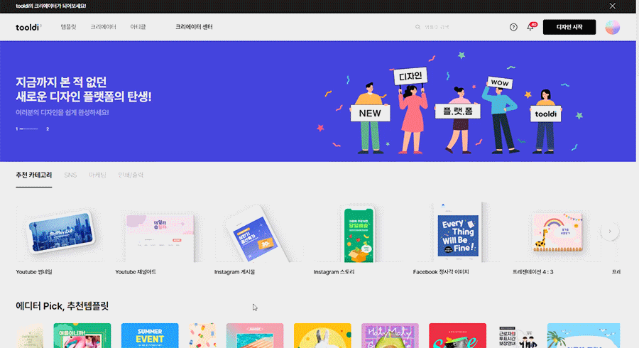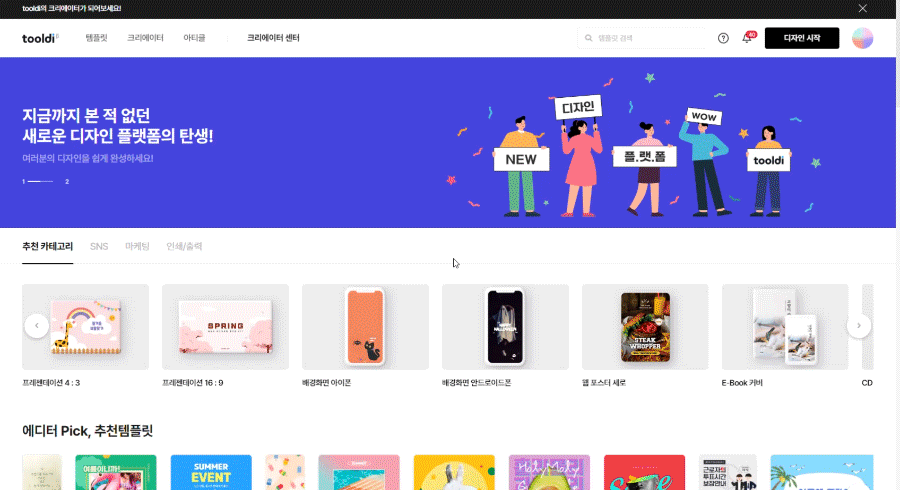 서비스 메인 화면의 추천 카테고리 영역에서 원하는 템플릿 카테고리에 마우스를 올리면