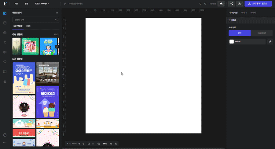 [빈 디자인 만들기]가 보여지고 클릭하면 선택한 캔버스 사이즈로 편집기가 실행됩니다.