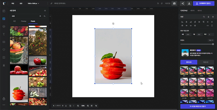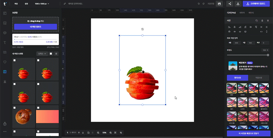 불러와진 사진을 선택하면 우측 속성창에 배경제거(beta) 버튼이 나타납니다.