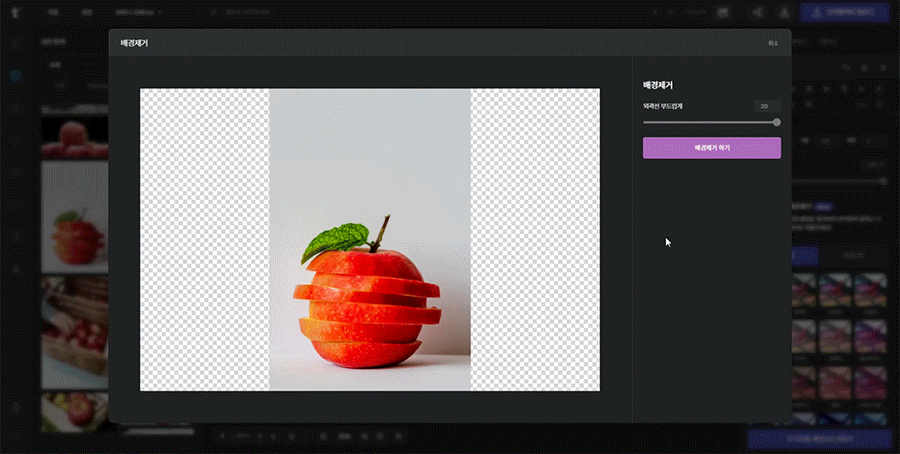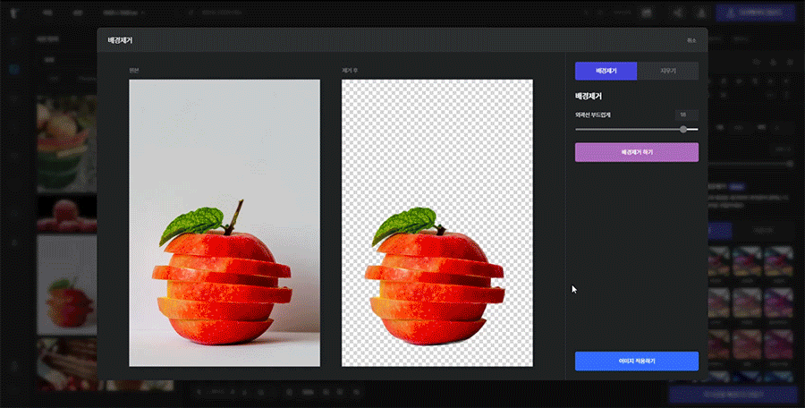 작업이 모두 끝났다면 [이미지 적용하기] 버튼을 눌러주세요! 캔버스에 배경제거된 사진이 올라옵니다.