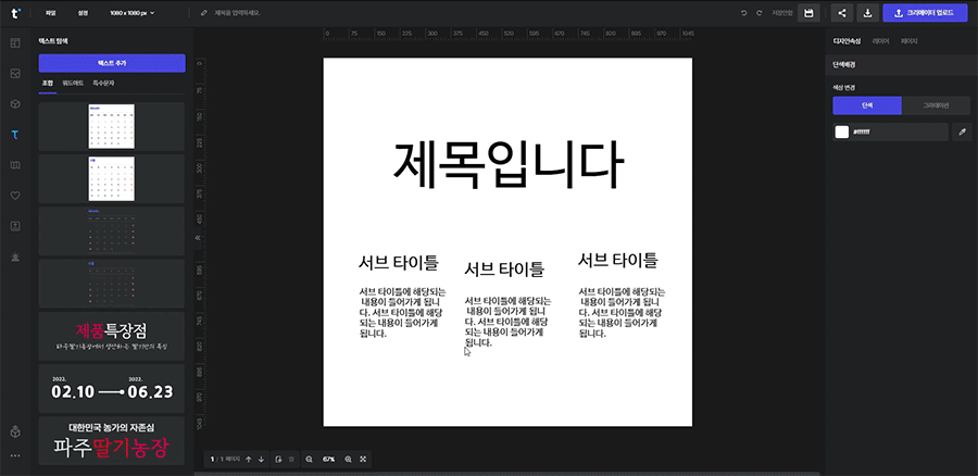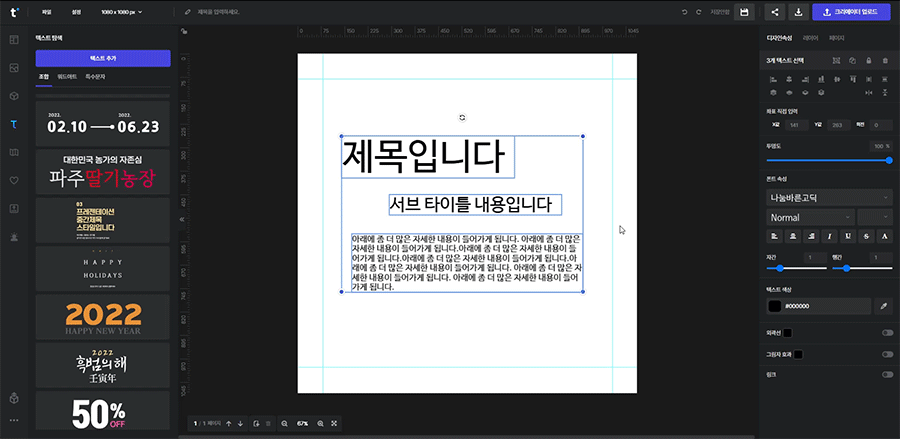아래의 예시와 같이 서브 타이틀과 하단 내용의 위치가 맞지 않을 때 각각을 선택하여 위치를 맞춰 줄 수 있습니다.