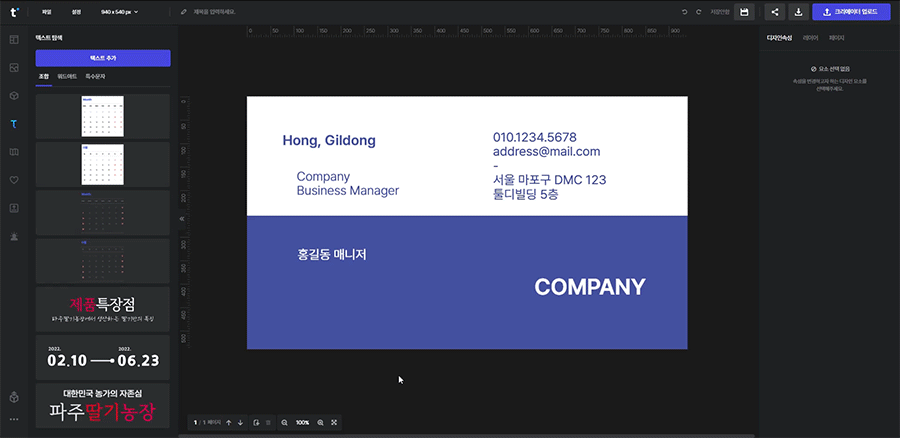 텍스트나 요소 등의 오브젝트를 선택하면 우측 디자인 속성 창에서 정렬을 선택할 수 있는 아이콘이 보여집니다.