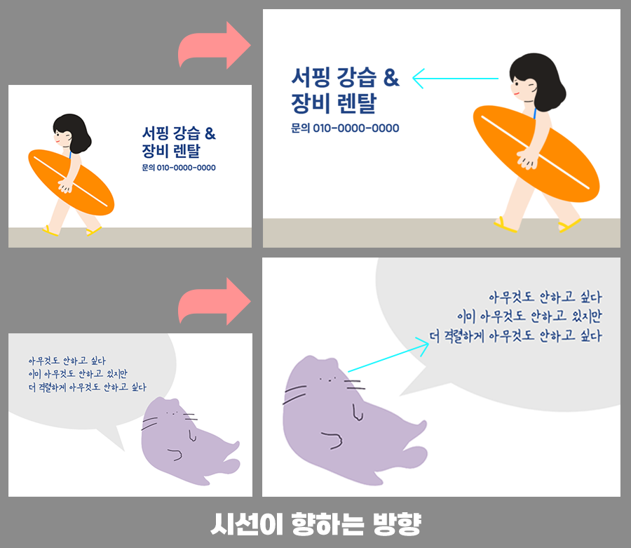 오른쪽 이미지와 같이 시선이 향하는 곳으로 배치하는 것이 자연스럽게 연결된 느낌을 줍니다.