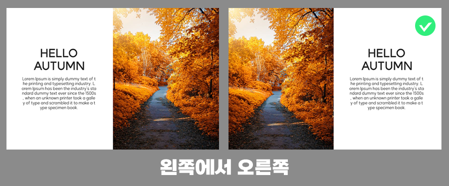 위의 왼쪽 이미지들과 같이 시선의 반대방향으로 내용을 배치하면 텍스트와 이미지가 분리된 느낌이 듭니다.