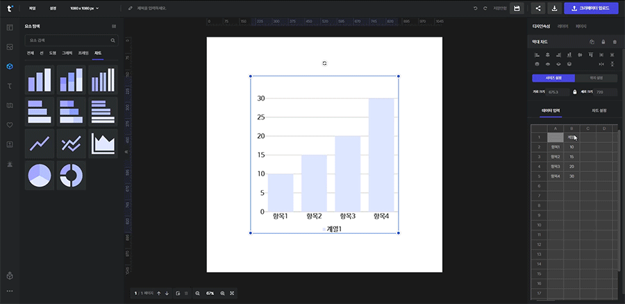계열과 항목을 수정하거나 추가, 삭제하면 캔버스 상의 차트에 데이터가 적용됩니다.