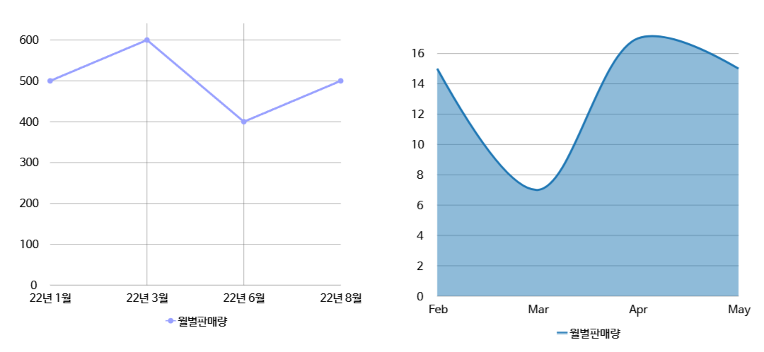 데이터 값의 추세를 표시. 시간의 경과에 따라 변하는 동향을 표시하는 데 적절.
