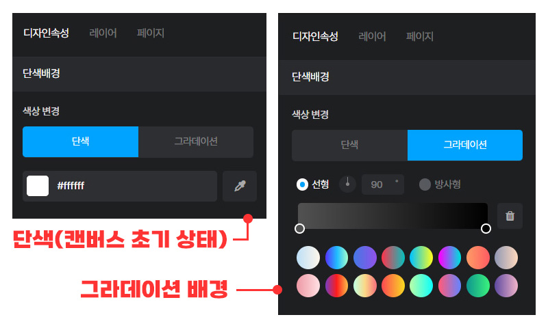 [단색/그라데이션/패턴/사진]을 선택하여 캔버스에 적용할 수 있습니다.