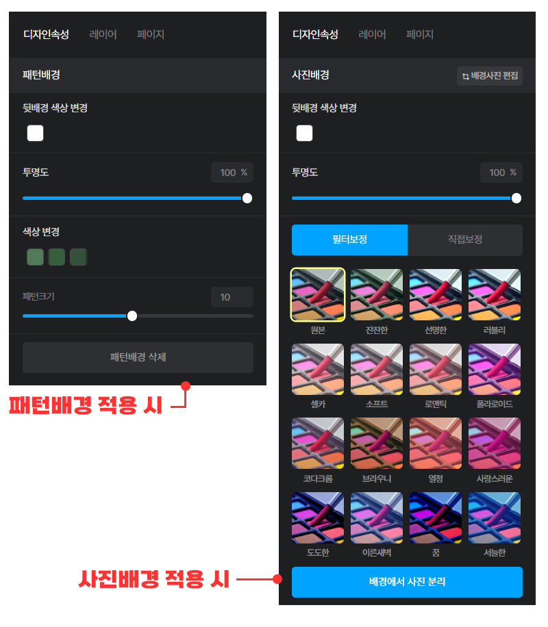 패턴 배경 사용을 원하지 않는 경우 [패턴 배경 삭제] 버튼을 통해 제거할 수 있습니다.