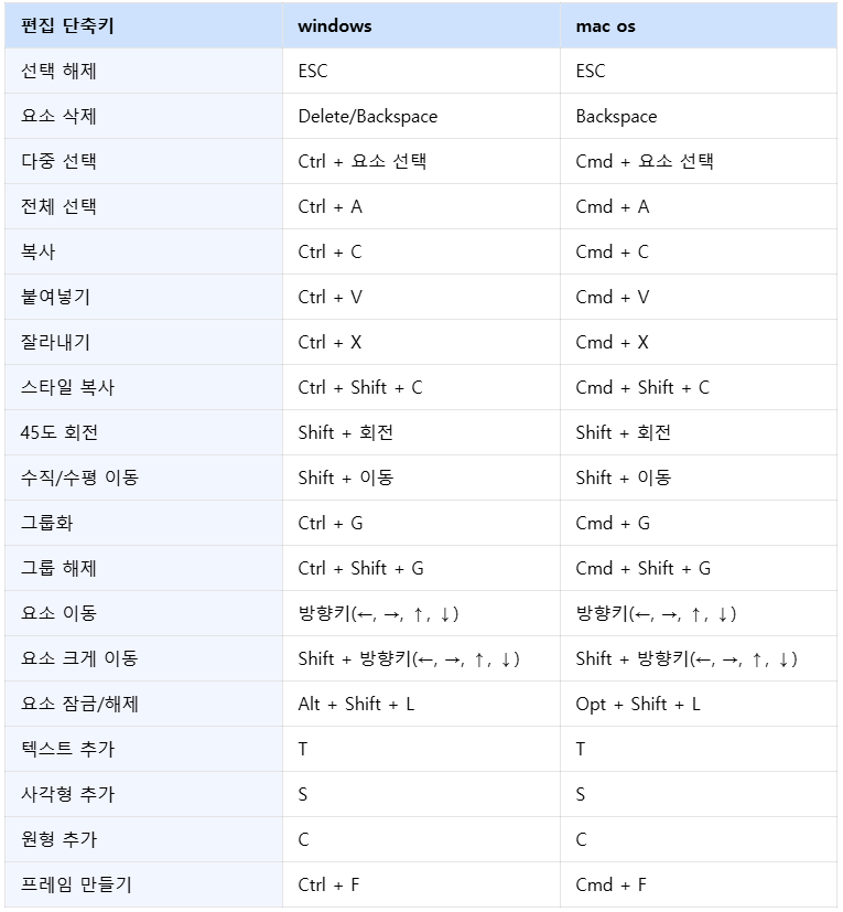 | 그룹화 | Ctrl + G | Cmd + G |