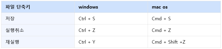 | 실행취소 | Ctrl + Z | Cmd + Z |