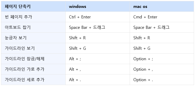 | 페이지 단축키 | windows | mac os |